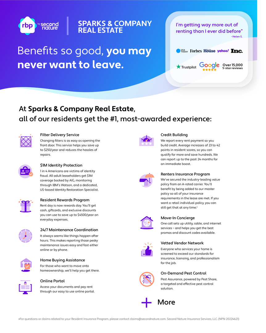 *** All Sparks & Company Real Estate residents are enrolled in the Resident Benefits Package (RBP) for $55.95/month which includes liability insurance, credit building to help boost the resident’s credit score with timely rent payments, up to $1M Identity Theft Protection, HVAC air filter delivery (for applicable properties), move-in concierge service making utility connection and home service setup a breeze during your move-in, our best-in-class resident rewards program, on-demand pest control, and much more! More details upon application.***